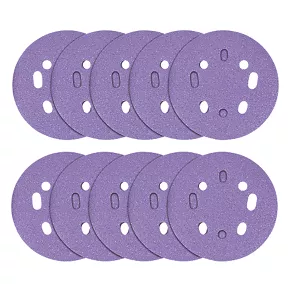 High performance, multi-material long-life zirconium abrasive. Provides up to 4 times longer life than conventional abrasives. Suitable for wood, paint, plaster and metal. Designed for heavier sanding applications where a sharp, ultra-durable grit is needed for fast stock removal or stripping back multiple layers of paint or other finishes. Increased spacing between the grit particles of grains reduces clogging and allows fast stock removal, especially on gummy, resinous timbers, fillers and during paint removal. Grit maintains cutting performance by fracturing away in use to expose fresh, sharp cutting faces. Dual resin bonding layers keep the abrasive grit firmly bonded to the backer for increased lifespan. Hook and loop fixings give a secure fix to the power tool base and offer fast, easy removal, increasing productivity when working through grits.